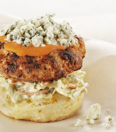 Buffalo Chicken Burgers with Blue Cheese Slaw