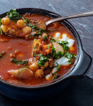 Add broth, spaghetti sauce, chickpeas, kidney beans, pasta, pepper and bring to a boil.