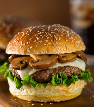 To assemble: Place patty with melted cheese on bun. Top with bacon, lettuce, tomato, onion and sautéed mushrooms. Serve with favourite condiments.
