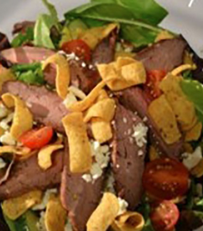 Combine all salad ingredients together, dress salad with dressing and top with barbecued flank steak strips.